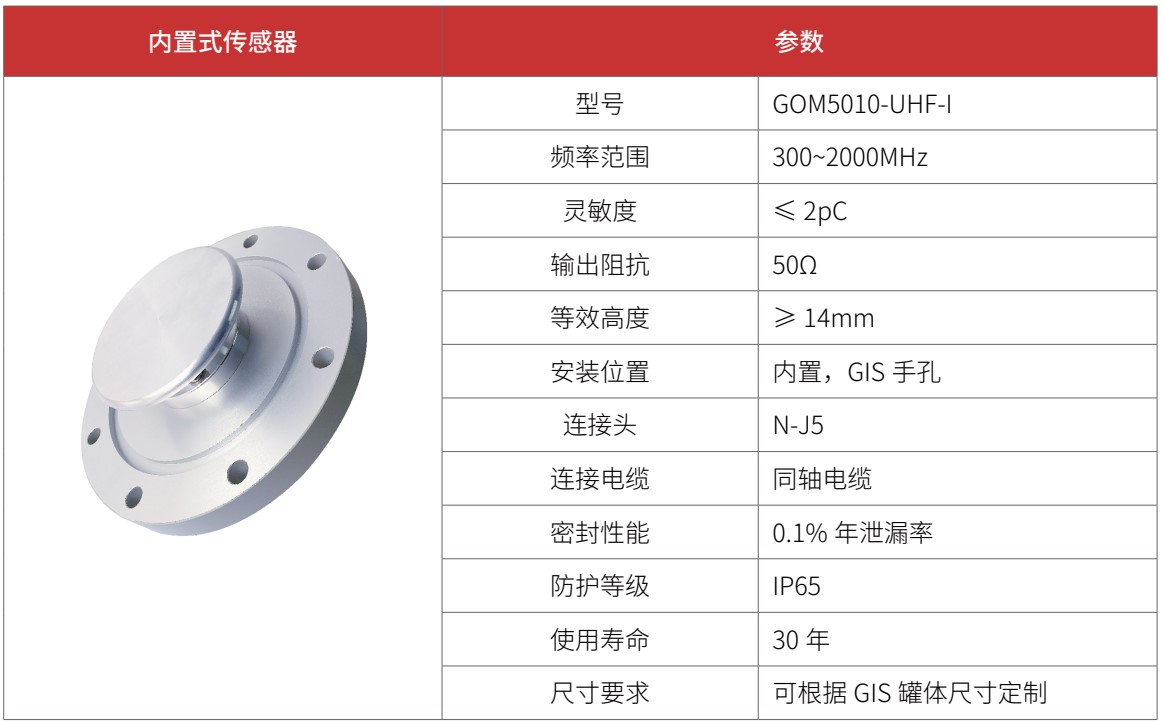 GOM5010-UHF-I GIS特高频内置式传感器。内置传感器由于安装在 GIS 本体上与 GIS 形成一体,能直接接收到 GIS 罐体内部的信号,其灵敏度远高于外置式传感器,而其独特的结构设计保证了 GIS 正常的运行,现在被广泛运用。