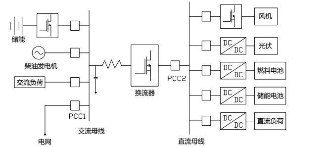 既含有交流母线又含有直流母线,既可以直接向交流负荷供电又可以直接向直流负荷供电,因此可称为交直流混合微电网。混合微电网的提出是为了避免DG和负荷接入交流微电网或直流微电网时需要多次进行换流所带来的诸多问题。其中将使用到固态直流断路器和固态交流断路器。